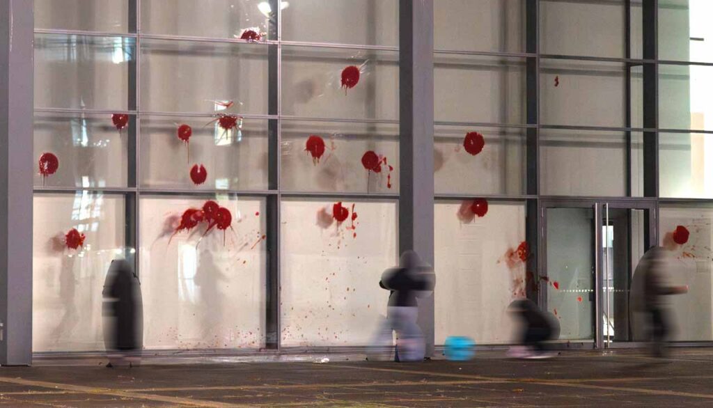 In den frühen Morgenstunden findet direkt am Veranstaltungsort des Fleischkongresses eine öffentlichkeitswirksame Aktion statt. Eine unbekannte Initiative setzt Kunstblut ein, um auf die verborgenen Konsequenzen der industriellen Tierhaltung aufmerksam zu machen. Die Aktion verdeutlicht die Diskrepanz zwischen der Selbstdarstellung der Branche und den realen Folgen für Tiere, Umwelt und Gesellschaft.