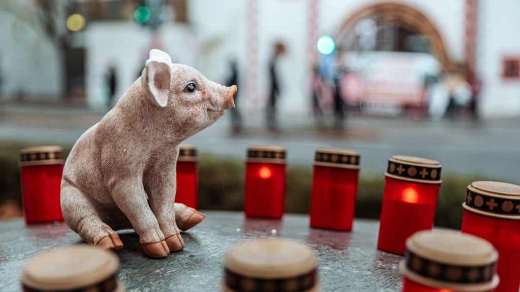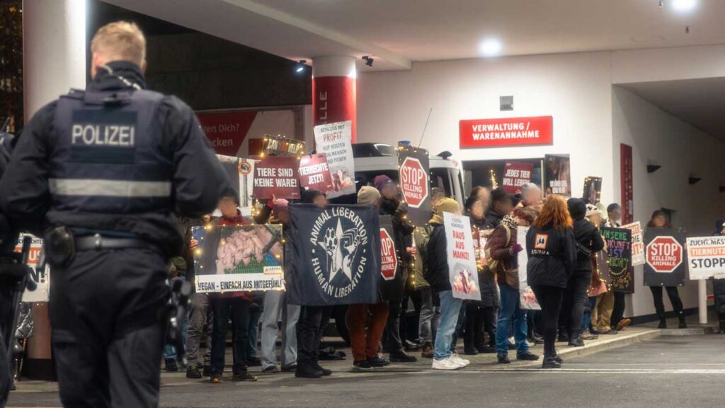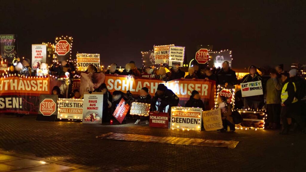 Auch die Proteste gegen den Fleischkongresses konnten dieses Jahr erneut gesteigert werden. „Wir dachten, die Aktionen der letzten Jahre seien nicht zu toppen – aber wir wurden eines besseren belehrt“, so Fili M. euphorisch. Dabei fand die erste Aktion bereits in der Nacht vor dem Kongressbeginn statt: Aktivist*innen dekorierten die Fassade der Rheingoldhalle mit Kunstblut. Mit ihrer Aktion wollten sie das versteckte Leid der Tieren in der Massentierhaltung sichtbar machen: „Die Aktion verdeutlicht die Diskrepanz zwischen der Selbstdarstellung der Branche und den realen Folgen für Tiere, Umwelt und Gesellschaft.“ (mehr dazu)