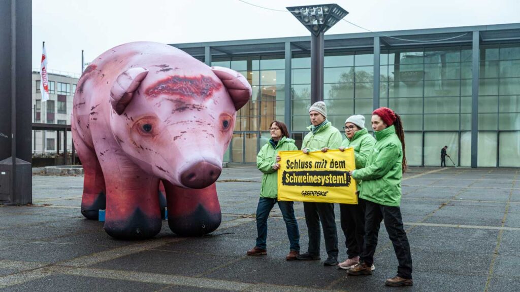 Zwar war das „Blut“ am nächsten Morgen schnell beseitigt, doch die Kongressteilnehmenden kamen dennoch nicht zur Ruhe. Schon nach wenigen Stunden gelang es Greenpeace-Aktivist*innen mit einer spektakulären Aktion im Inneren der Rheingoldhalle, den Programmablauf vorübergehend lahm zu lagen: Während eines Panels mit führenden Köpfen der Fleischindustrie ploppten plötzlich zwei Banner von der Decke. Zeitgleich wurde der Saal mit einer unüberhörbaren Audiobotschaft beschallt, welche die Missstände der Branche anprangerte und eine Fortführung des Kongressprogramms unmöglich machte.