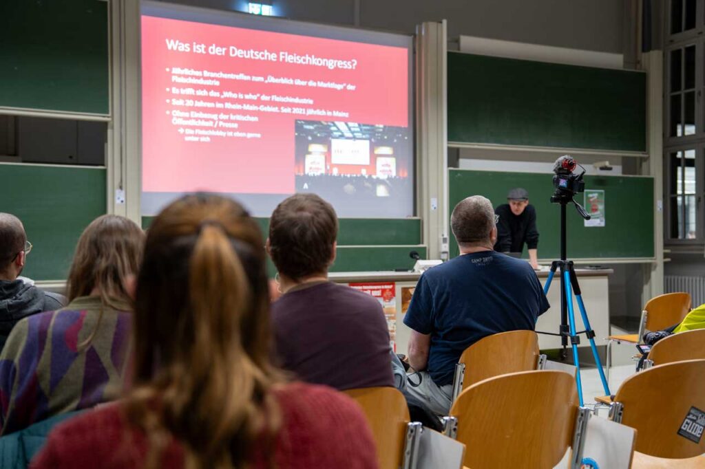 Seit 2023 demonstriert das „Bündnis gegen den Fleischkongress“ gegen das jährliche Treffen der Fleischindustrie in der Mainzer Rheingoldhalle. Nach vielfältigen und teilweise spektakulären Protestaktionen der Vorjahre entschied sich das Bündnis, dieses Jahr noch einen Schritt weiter zugehen und veranstaltete am Vorabend des Fleischkongresses einen GEGENkongress.