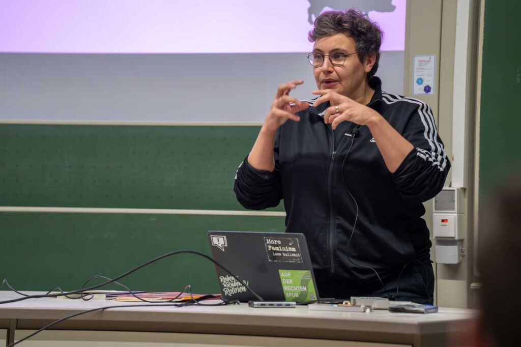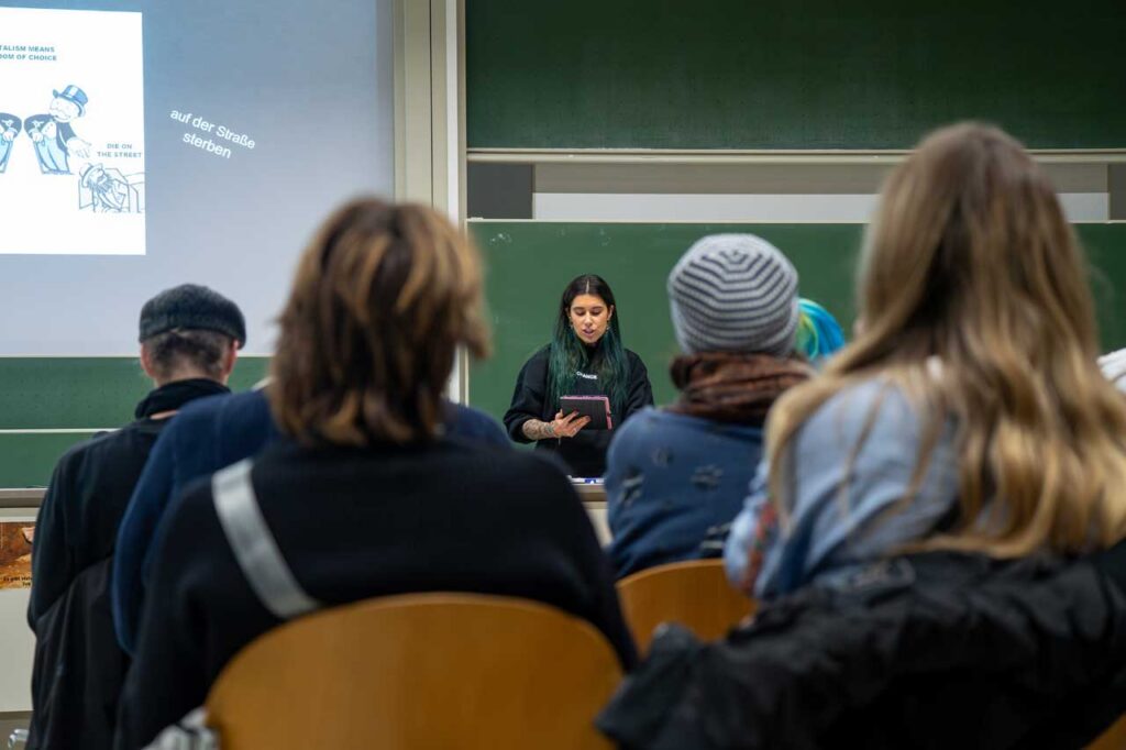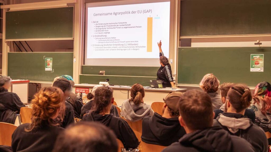 Alrun Schleiff von der Heinrich Böll Stiftung RLP und der Forscher und Referent Chris Rombeck informierten in ihren Vorträgen über die zerstörerischen Umweltauswirkungen der Tierindustrie und des Fleischkonsums. Die Aktivistin Racoon warf einen kapitalismuskritischen Blick auf das System Tierindustrie und Aktivist*innen von Gemeinsam gegen die Tierindustrie und Animal Rebellion warben für eine bewegungsübergreifende Vernetzung antikapitalistischer Kämpfe.