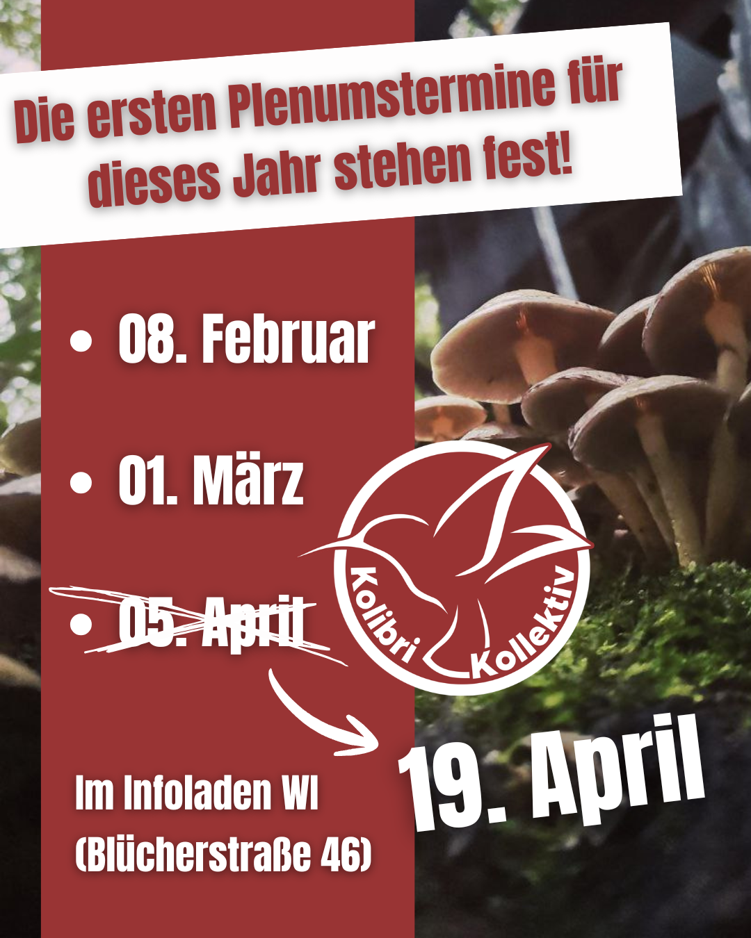 Achtung Datumsänderung: Unser Plenum findet normalerweise immer am 1. Sonntag im Monat statt. Auf Grund der Feiertage treffen wir uns im April erst am 3. Sonntag. Wir treffen uns im Infoladen in Wiesbaden. Neue Menschen sind immer sehr willkommen!